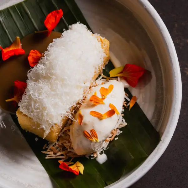 Don’t miss a sweet finish with the buttery Cassava Cake with Gula Melaka Caramel, Toasted Coconut and Patis Ice Cream. Chef Alex’s take on this classic Filipino dessert is a masterclass in contrasts. It has a perfect balance of sweet and salty elements, warm cake with cool ice cream, and velvety smooth sauce with the crunchy coconut.