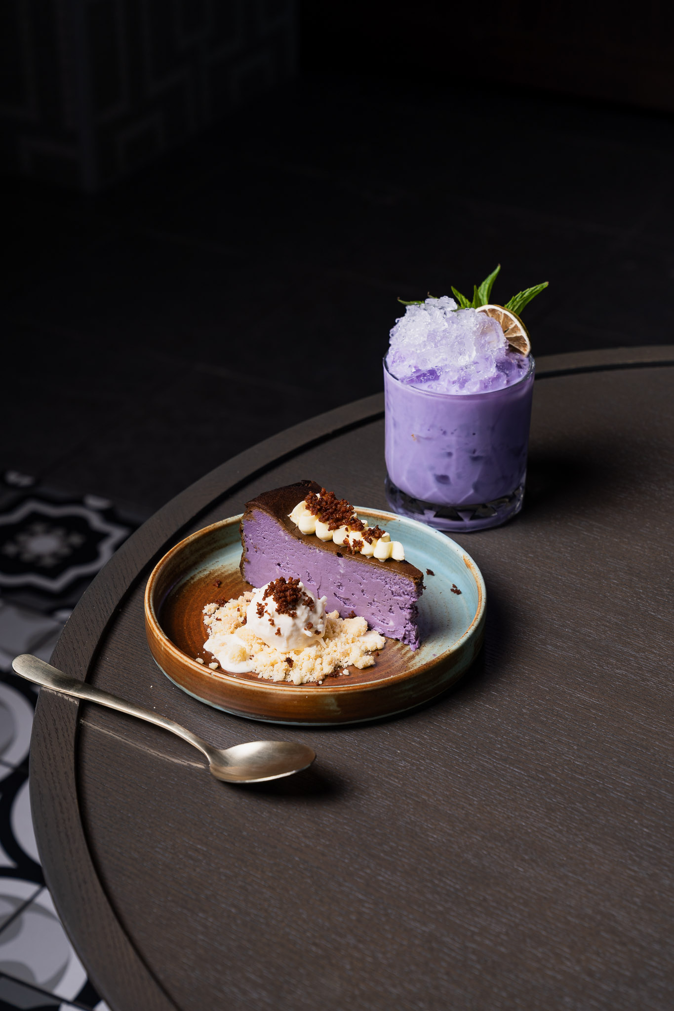 Earthy, delicately floral and reminiscent of vanilla, the flavour of ube brings Basque burnt cheesecake to a new realm. Baking this cheesecake for a shorter amount of time at a high temperature gives it a light and creamy texture with caramelised edges. Finish your meal on a high. Pictured with the Purple Paradise cocktail with ube liqueur.
